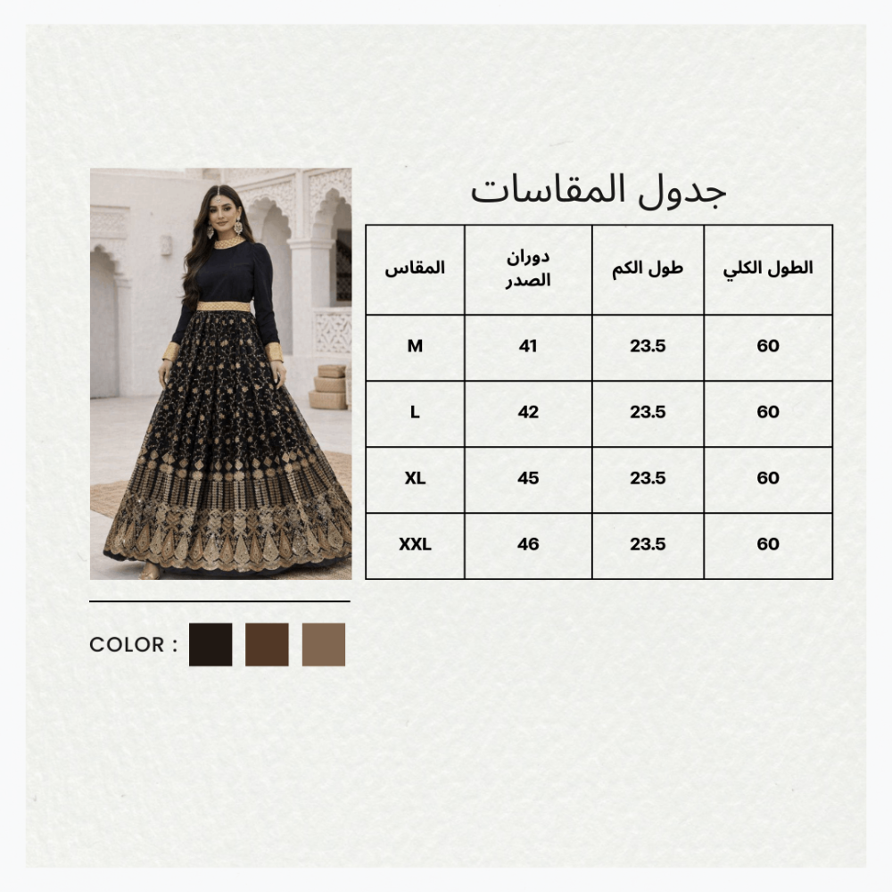 إطلالة تجمع بين الفخامة والأصالة مع فستان أسود ملكي من المخمل الناعم، يمنحك حضورًا راقيًا ومريحًا في الخروج والمناسبات الخاصة.