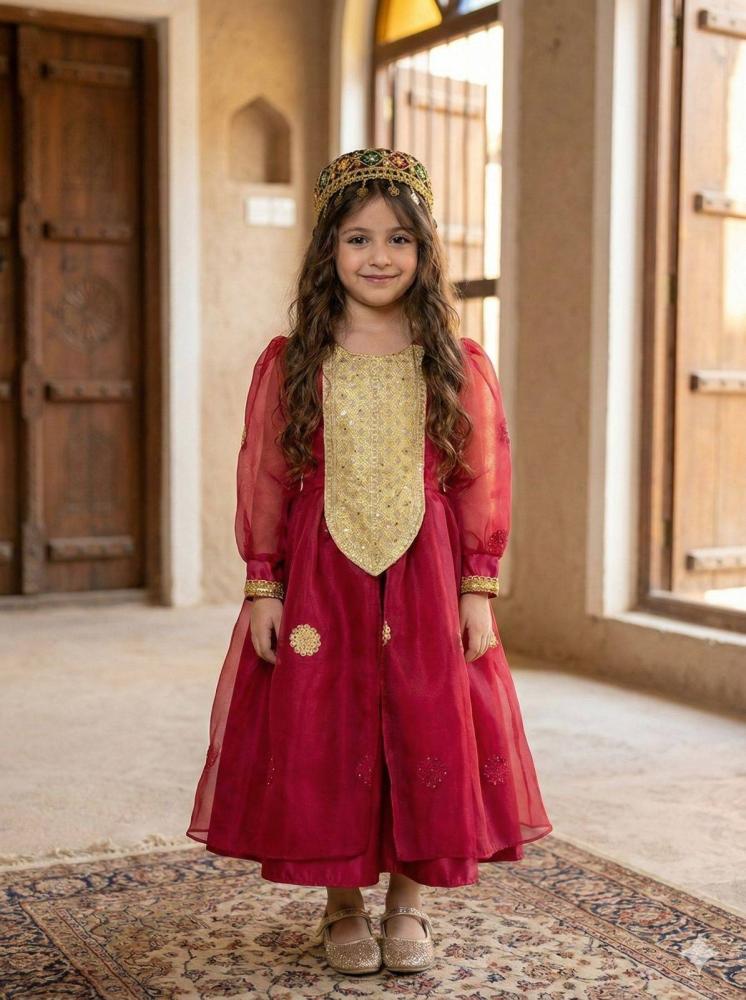 فستان فوشي طويل بتطريز ذهبي ولمسة شيفون ناعمة، يمنح طفلتك إطلالة ساحرة وأنيقة، مثالي للمناسبات التراثية والاحتفالات وجلسات التصوير.