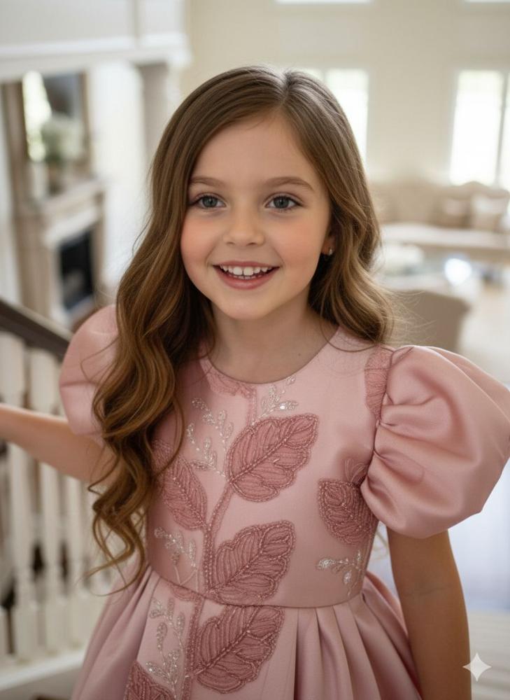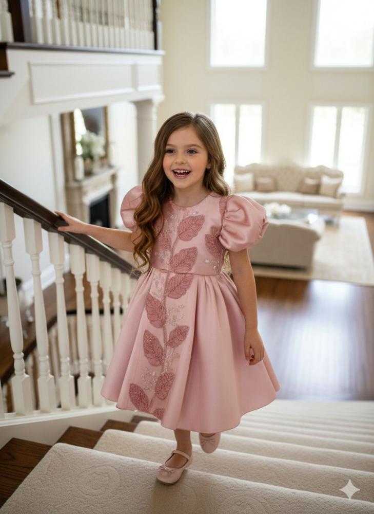 فستان لون بينك بدرجة وردي غباري راقية يمنح طفلتك إطلالة أميرية ناعمة تجمع بين الفخامة والرقة في كل مناسبة.