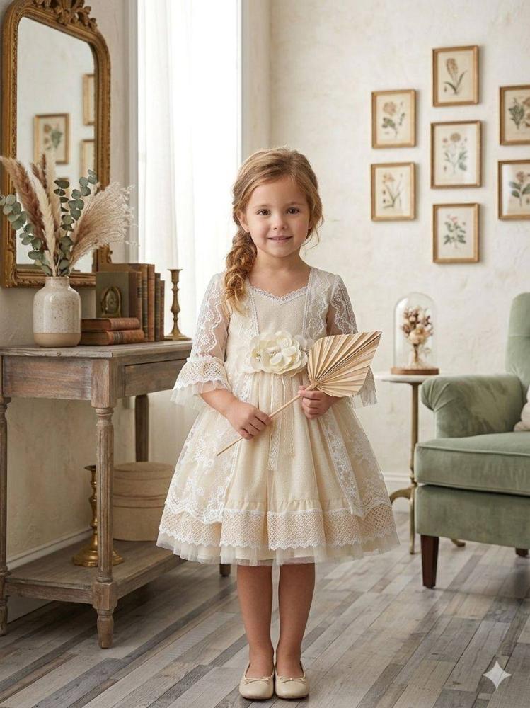 فستان اطفال بنات بتصميم راقٍ يجسد الأناقة الكلاسيكية بلمسة بوهو شيك ناعمة ليمنح طفلتك إطلالة فاخرة ومميزة في المناسبات الخاصة يأتي بلون بيج كريمي هادئ مع تفاصيل دانتيل وتول تضيف لمسة حالمة وأنيقة.