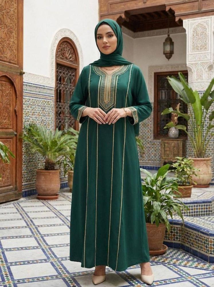 إطلالة أنيقة تجمع بين الفخامة والهدوء مع جلابية خضراء من المخمل الناعم بتطريز ذهبي بسيط يبرز ذوقك الراقي ويمنحك حضورًا مميزًا في الخروج والمناسبات.