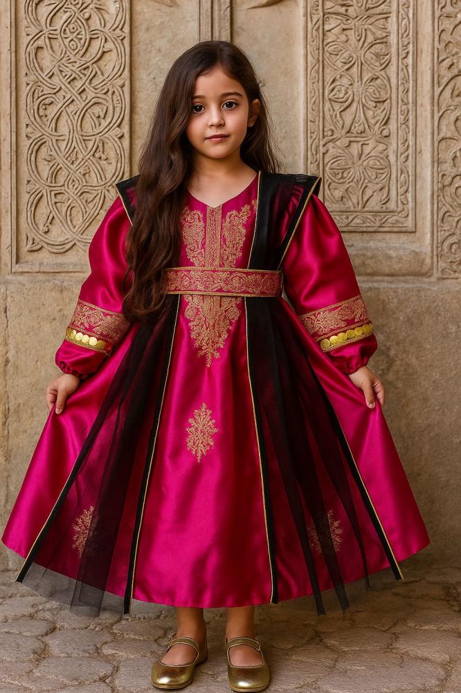 فستان فوشي واسود بتصميم تراثي فاخر يمنح طفلتك إطلالة ملكية أنيقة، تجمع بين الفخامة والنعومة وتليق بالمناسبات الخاصة وجلسات التصوير.