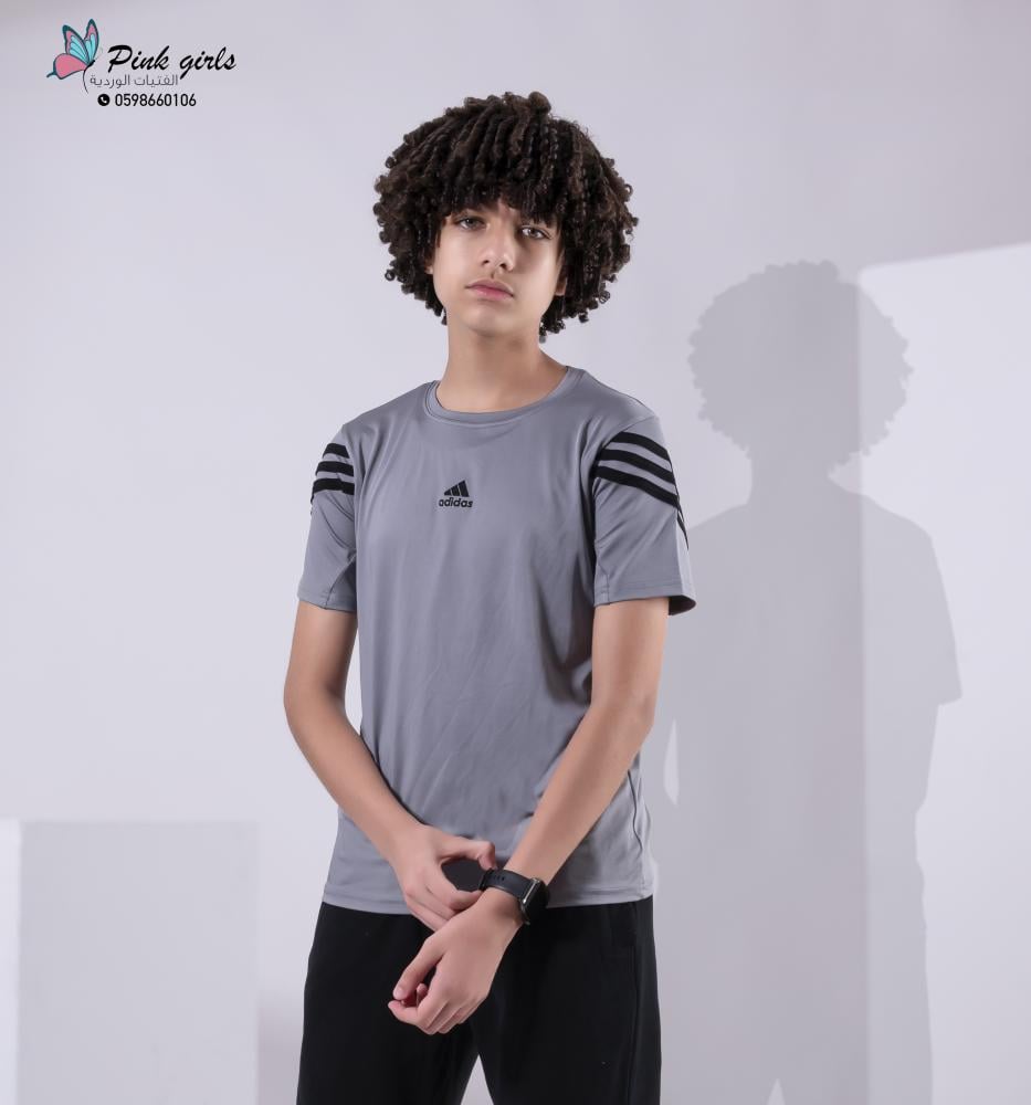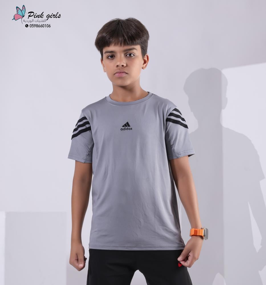 تيشيرت اديداس رياضي يجمع بين البساطة والأناقة، بلون رمادي أنيق مع خطوط سوداء وتصميم مريح يناسب كل الأنشطة اليومية والرياضية.