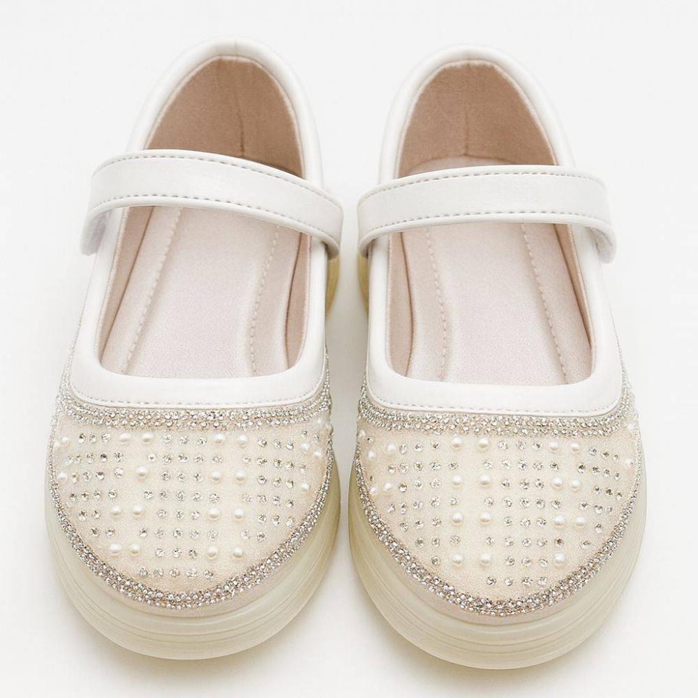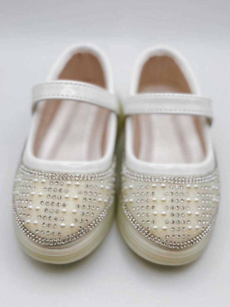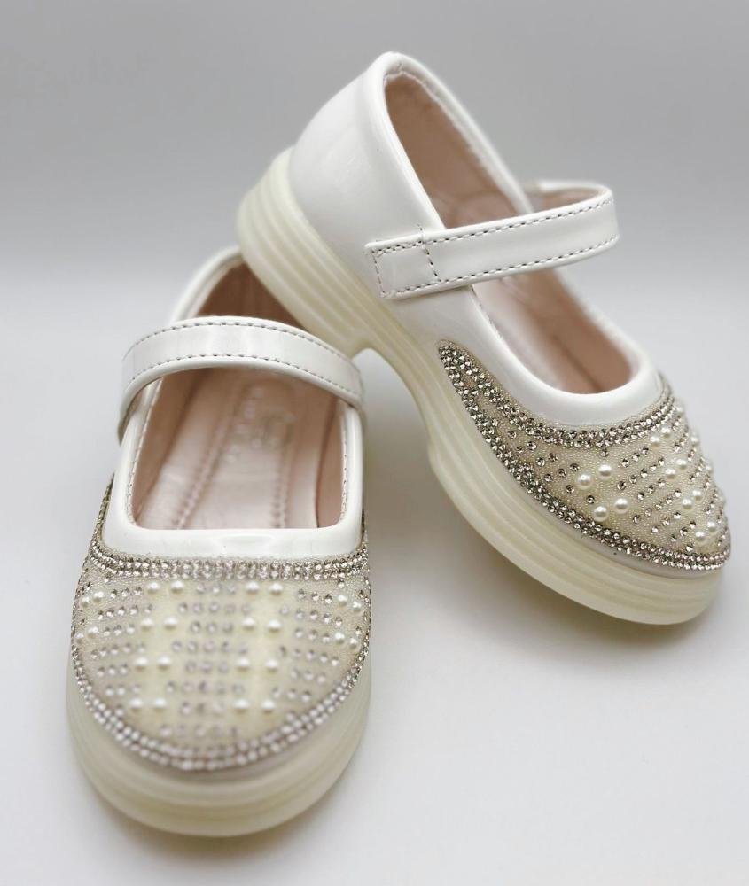 حذاء بناتي ابيض أنيق يمنح طفلتك إطلالة راقية تجمع بين البساطة والفخامة، بتصميم لامع يناسب أجمل المناسبات ويليق بمختلف الفساتين.