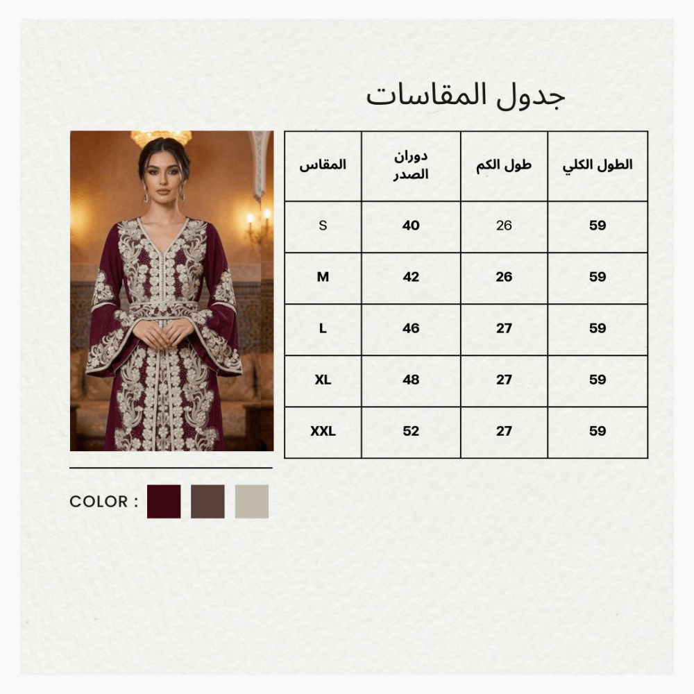 فستان جلابية بلون عنّابي فاخر وتطريز عاجي كثيف بتصميم ملكي راقٍ، يمنحك إطلالة مبهرة تجمع بين الفخامة والرقي في كل مناسبة.