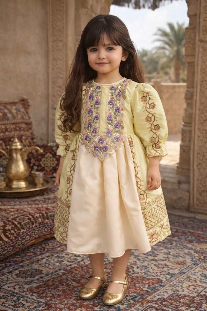 لو تبحثين عن إطلالة تراثية مبهجة تليق بأجواء الاحتفال فإن فستان قرقيعان هو الخيار المثالي لطفلتك يأتي بتصميم أنيق مستوحى من التراث مع لون ليموني فاتح يبعث على الفرح ويعكس أجواء القرقيعان المميزة.